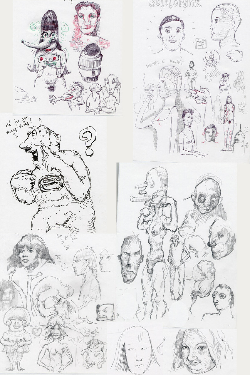 Gribouillis compulsifs faits lorsque j’attends mon correspondant, ou quand je bavasse avec lui, avec elle. Quand il m’énerve, me fait rire, me fiche la pression, m’indiffère, me navre, m’épate, m’emballe, me jette, m’enthousiasme, s’enthousiasme, se coupe en quatre ou m’envoie balader, m’asticote, me réclame, me gronde, me supplie, me trahit, me fait des propositions convenables ou salaces, pertinentes ou consternantes, me ment, me séduit, m’irrite ou me bouleverse… Quelques pages de blocs sténos scannées presque au hasard (presque parce que sur certaines feuilles l’on pouvait lire des données personnelles) totalement déconnectées du contenu des conversations… Dès que l’esprit est occupé, que le langage articulé est au premier plan, que les barrières qui mènent dans nos profondeurs se lèvent, apparaissent des images connotées sexuellement. C’est comme ça. Qu’est que ça doit rigoler en sous-sol! Vous marrez pas, c’est sûrement pareil pour vous. D’ailleurs vous devriez aller y voir !…